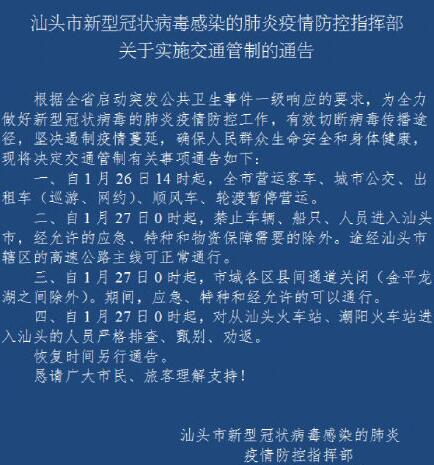 今天上午,记者获悉,汕头市新型冠状病毒感染的肺炎疫情防控指挥部发布《关于实施交通管制的通告》,27日0时起禁止车辆、船只、人员进入汕头市。汕头是广东省首个为了应对新型肺炎疫情,进行交通管制的城市。