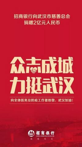 1月25日,大年初一,在全国上下防控新型冠状病毒肺炎疫情的关键时刻,招商银行决定通过武汉市慈善总会向武汉市捐款2亿元,全力支援武汉抗击疫情。在武汉市新型肺炎防控指挥部发布接受社会捐赠的公告后,招行第一时间响应号召,特事特办启动相关流程,在短时间内完成内部审批,捐出2亿元驰援武汉。据悉,捐助的款项将由武汉市新型肺炎防控指挥部作为疫情防控专款使用。