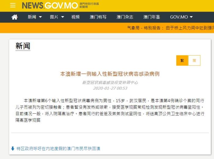 【香港商报网讯】據澳門特區政府新聞局網站消息,澳門新增1例新型冠狀病毒確診病例,目前已有6人感染新型冠狀病毒。