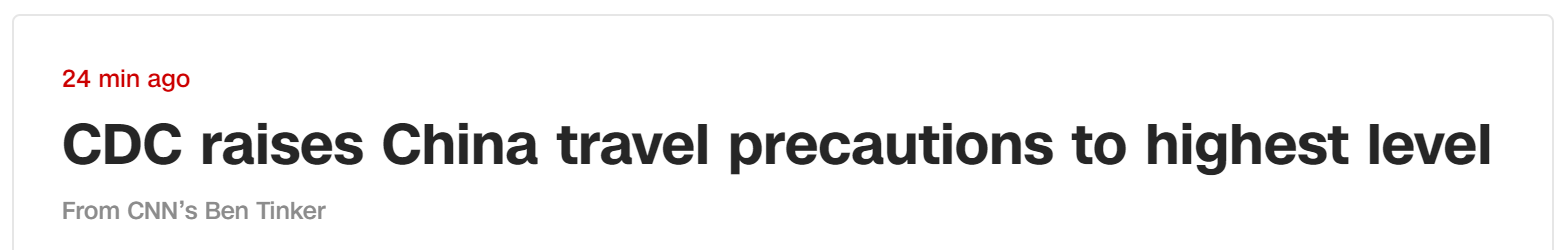 美國有線電視新聞網(CNN)最新消息,美國疾病控制與預防中心(CDC)當地時間27日將針對中國的旅行預防措施提升至“警告”的最高級別。這意味著建議旅行者“避免不必要的旅行”。