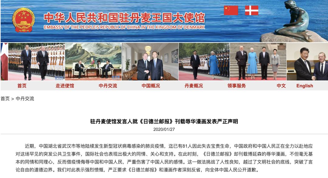 在中國為抗擊新型冠狀病毒而不懈努力之際,丹麥媒體《日德蘭郵報》竟借題發揮,刊登侮辱五星紅旗的漫畫。我駐丹麥使館發言人1月27日對此發表嚴正聲明。