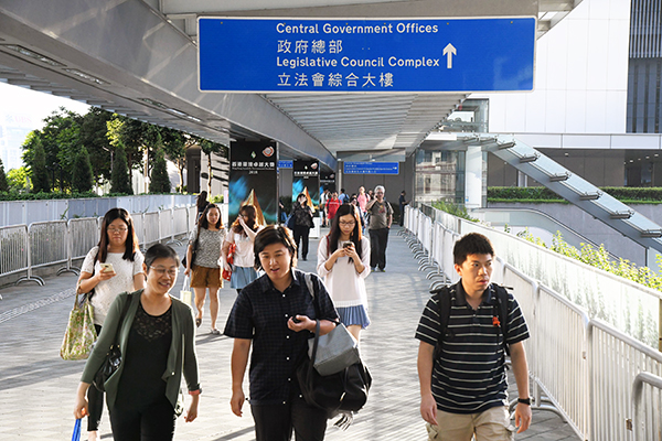 港府昨日宣布防疫特別安排 ,農曆新年假期後部分政府僱員可留在家中工作。圖為政府總部平日上下班情況。資料圖片