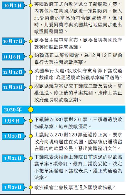 按照安排,英國定於1月31日正式脫歐,隨後進入過渡期(定於今年12月31日結束),期間維持現狀,以便同歐盟就全面貿易關係達成協議,不過去年12月約翰遜贏得英國大選後,加入了脫歐過渡期不得延長的條款,據此歐英必須在11個月內完成貿易談判,否則英國將面臨硬脫歐風險。