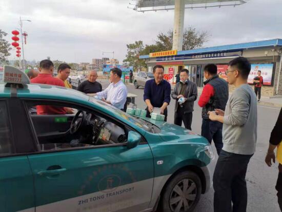 (1月22日,罗卫民与局领导给南站出租车司机配发口罩)