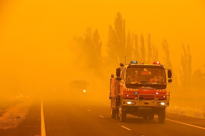 2月1日,消防车辆从澳大利亚首都堪培拉以南的公路上驶过,路旁林火蔓延。新华社/美联