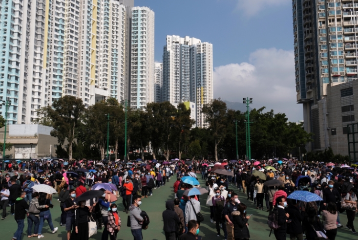 九龍城有店舖出售口罩,開賣前近2000人排隊擠滿球場。 路透社