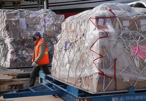1月28日,武汉天河国际机场共有3架全货机满载医疗防疫物资抵港,包含医用口罩、医用帽子、乳胶手套、防护服、消毒液等各类防护用品及医疗药品,共计60余吨。 新华社