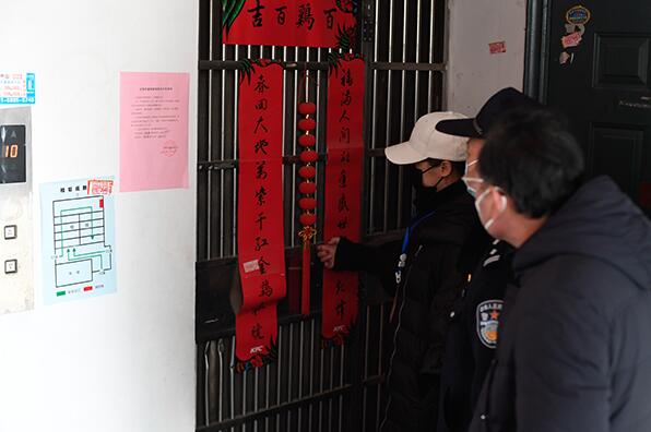 1月29日,在浙江省杭州市西湖区古荡街道嘉绿苑社区,社区工作者上门为一户实行居家隔离的居民送去食物。 新华社
