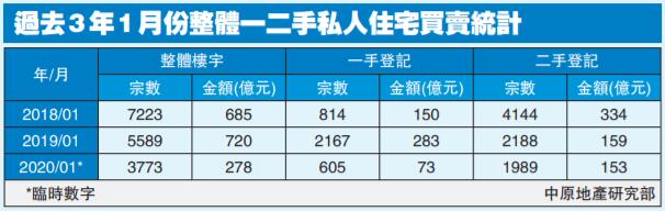 中原地產研究部高級聯席董事黃良昇指出,1月暫錄605宗一手樓成交,總值72.6億元,按月暫跌6.3%及34.5%。雖然天水圍大型新盤熱賣,並於1月陸續登記,但土地註冊處工作日數減少,拖慢登記速度,以致宗數連續兩個月低於1000宗,兼創13個月新低。而金額則創近4年按月新低,主要是1月登記集中為低價上車新盤。