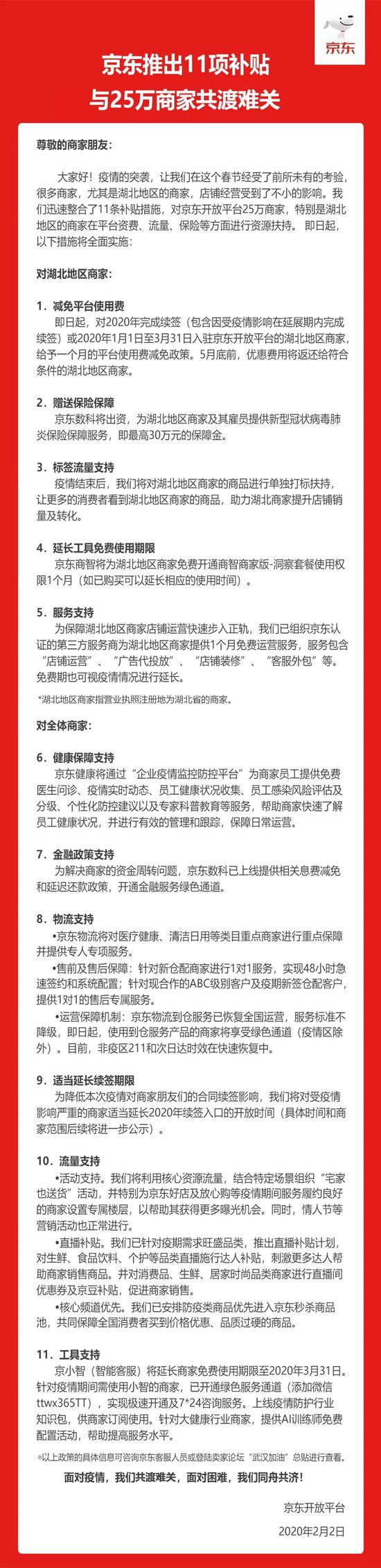 为帮助商家渡过难关,2月2日,京东面向平台25万商家推出了11项补贴支持措施。这些措施涵盖了费用减免、金融和物流支持、流量支持、技术支持、健康保障等,如京东健康为商家员工提供免费医生问诊服务、京东数科推出息费减免和延迟还款政策、京东物流对新仓配商家实现一对一服务和48小时急速签约……