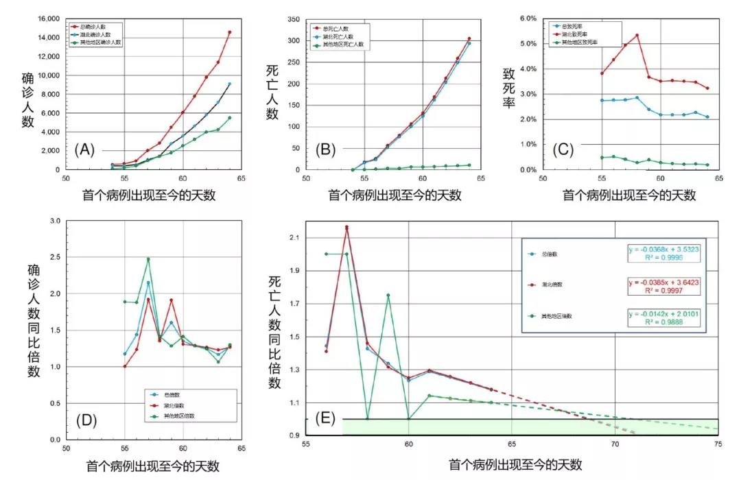 图2:假设新冠病毒肺炎nCov-2019的首个确诊病例出现日为2019年11月29日,确诊/死亡人数相对于天数的变化。表1的数据记录了自2020年1月22日至2020年2月1日的数据。在图E中,使用了从2020年1月29日开始的最后4天的数据添加了线性趋势线。对于总倍数,湖北倍数和其他地区的倍数来说,拟合度非常好(相关系数或sqrt(R2)> 0.99)。这表明倍数将在一周内减小到1.0,自此之后确诊和死亡人数将缓慢增长。