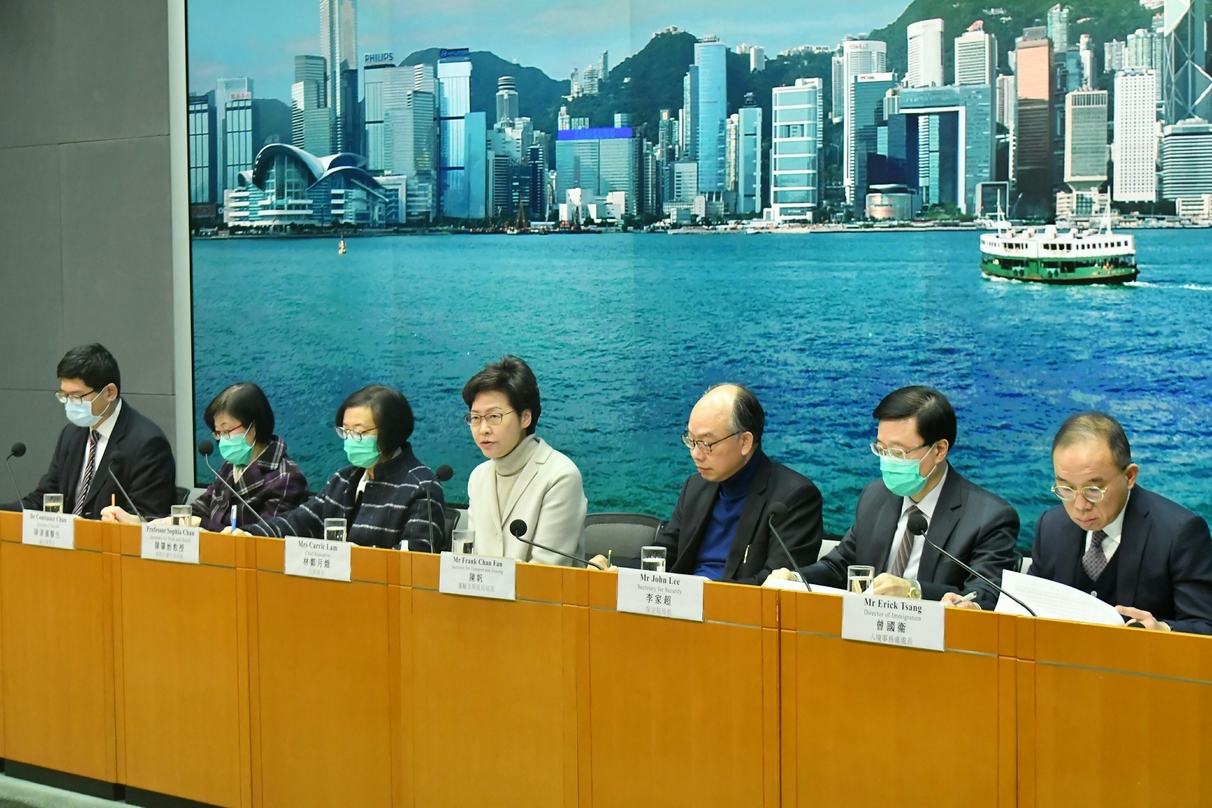 林鄭月娥昨午聯同食物及衛生局局長陳肇始、運輸及房屋局局長陳帆、保安局局長李家超、入境處處長曾國衛、醫管局行政總裁高拔陞等多位官員會見傳媒。