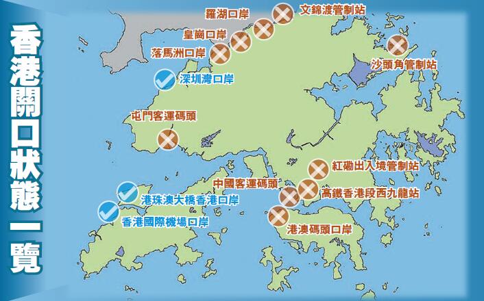 林鄭隨即宣布進一步收緊陸路、海路的跨境人流往來:由今日零時起,關閉羅湖、落馬洲、皇崗、港澳碼頭這4個口岸,只剩下深圳灣、港珠澳大橋香港口岸可使用。除此2個口岸可使用外,機場亦繼續運作。