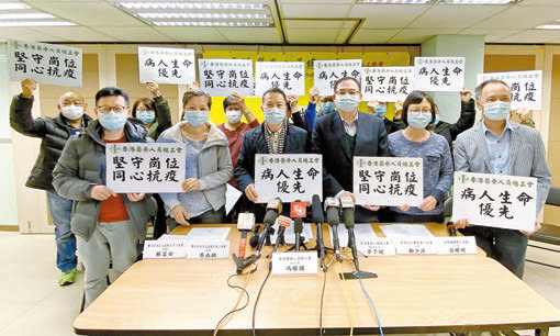 香港醫療人員總工會副主席馮權國(前排左三)表示 ,醫護人員不可因其他訴求影響醫療服務,呼籲前線醫護人員堅守崗位。記者黃永佳攝