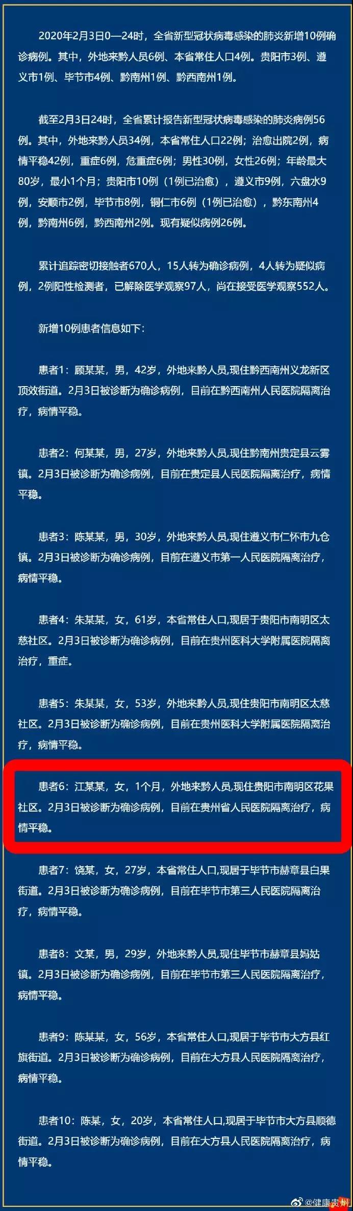 【香港商报网讯】2月3日0—24时,贵州省新型冠状病毒感染的肺炎新增10例确诊病例。其中,患者江某某,女,1个月,外地来黔人员,现住贵阳市南明区花果社区。2月3日被诊断为确诊病例,目前在贵州省人民医院隔离治疗,病情平稳。截至2月3日24时,贵州省累计报告新型冠状病毒感染的肺炎病例56例。