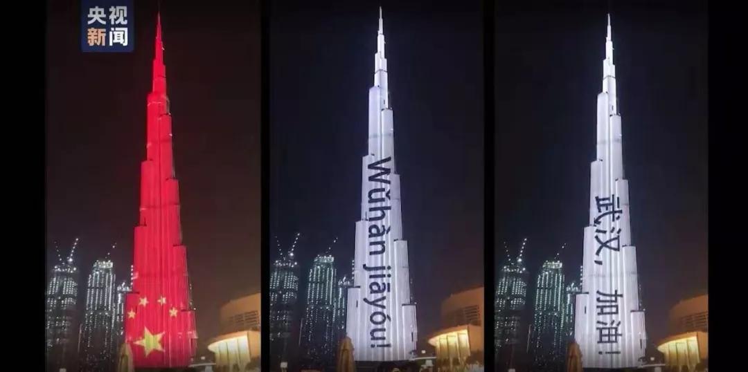 (图为迪拜哈利法塔亮起“中国红”、点亮“武汉加油”)