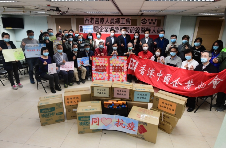 由香港中旅集團、招商局、華潤、太平保險、中銀香港、工銀亞洲、交通銀行、光大集團、粵海集團等多間中資機構組成的香港中國企業協會,昨日派代表到工聯會屬下分會香港醫療人員總工會慰問,並送上1萬個口罩、300盒維生素C及2000盒夏桑菊沖劑。總工會主席潘佩璆醫生表示,在物資短缺的時刻中資機構能送上如此多物資,萬二分感謝。他對94%仍堅守崗位的醫護人員感到自豪,形容是香港醫護界之光,亦是全球醫護界之光。
