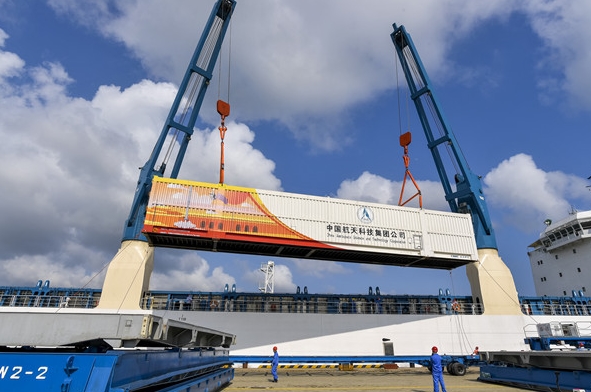 2月3日,停靠在海南文昌清瀾港的遠望號火箭運輸船隊將火箭產品安全吊裝下船。中新社記者 駱雲飛 攝