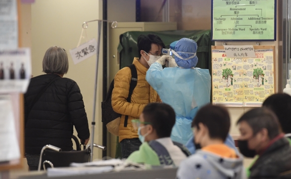 伊利沙伯醫院急症室醫護人員謹守崗位提供服務,為患者測量體溫。 (中通社)