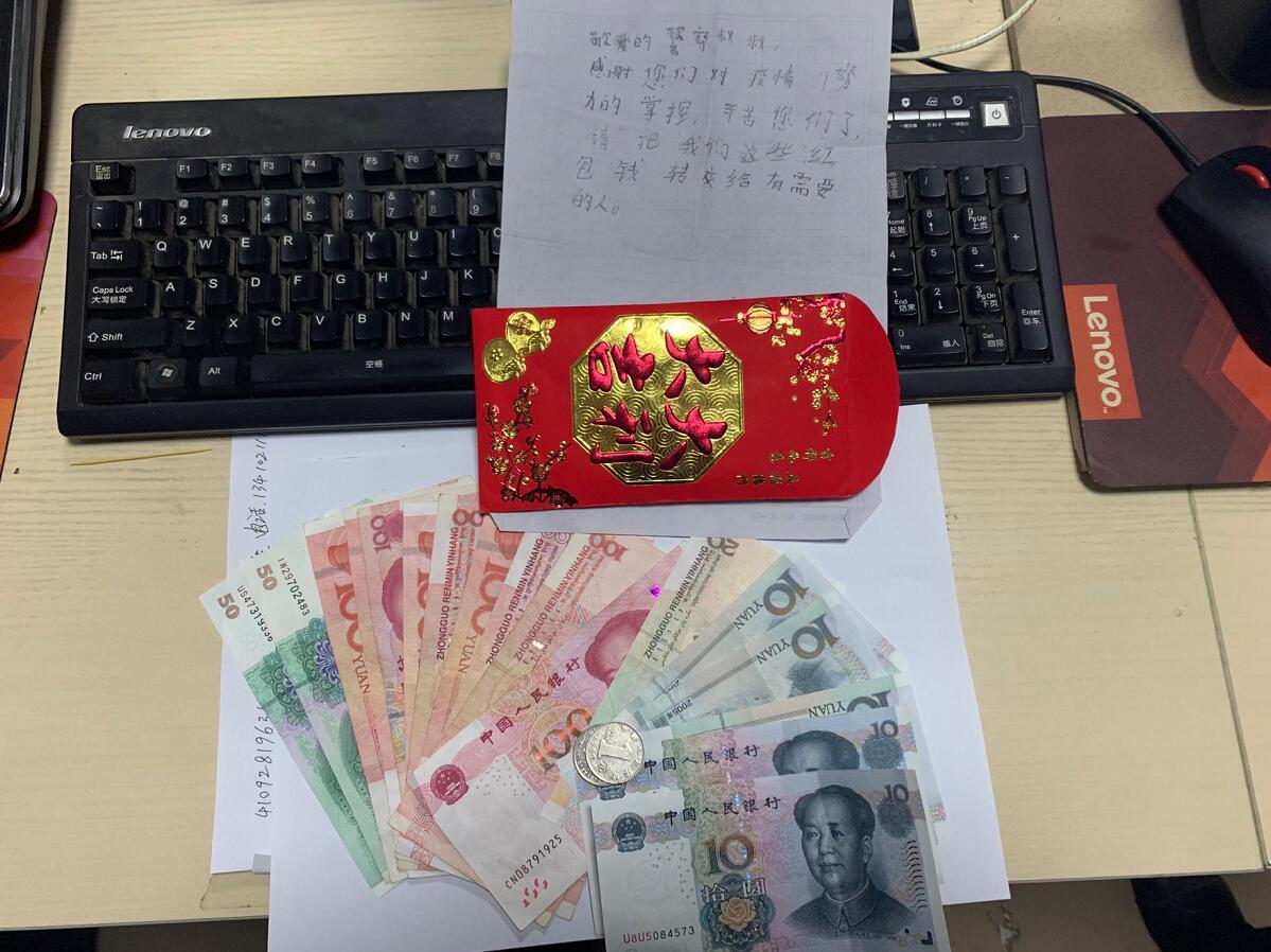 当天值班的另一名辅警沈鉴打开一看,这是一个印有“大吉大利”的红包里,有几张面额为10元、50元、100元的钞票,还有两个1元的硬币。经清点,一共是1072元人民币,里面还塞了一张原稿纸,背面用铅笔写着:“尊敬的警察叔叔,感谢您们对疫情的掌控,辛苦您们了,请把我的这些红包钱转交给有需要的人。”