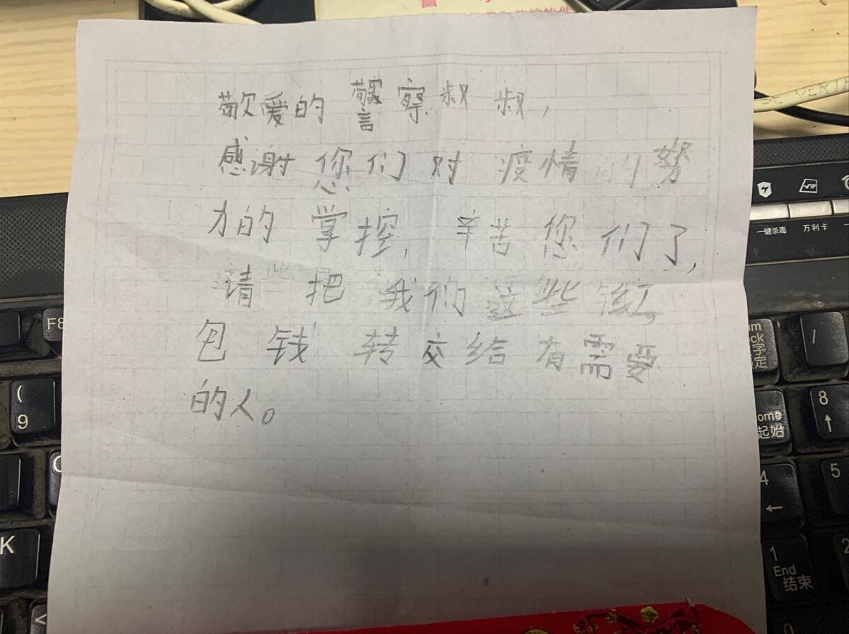 “知道你们抗“疫”危险,这是过年的红包钱,我们原先想买口罩送给你们的,但是没买着”。一位小男生留下一个红包、一张字条,与父亲匆匆离开了派出所的值班室。孩子稚嫩的笔迹,字里行间流露着对一线警员的敬意,以及对身处疫情下的人们的关爱。