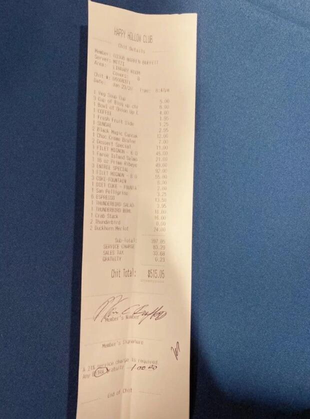 孙宇晨还在推特上晒出了当日晚餐的账单,显示结账金额为515.05美元。