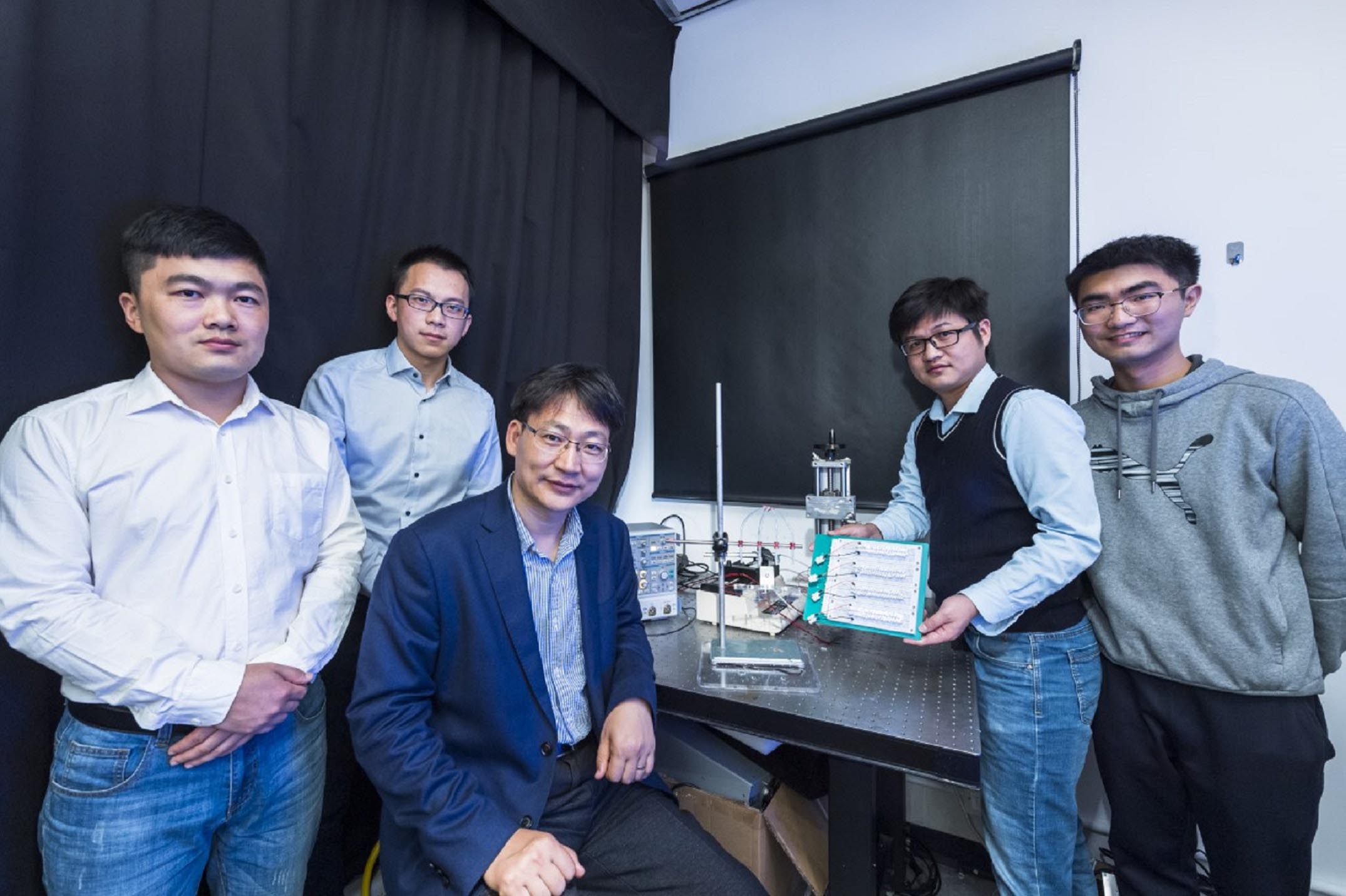 城大最新研發水滴發電機團隊部分成員,左起:鄭煥璽、徐王淮、王鑽開教授、張超博士和宋雨欣。