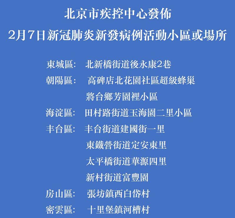 【香港商報網訊】記者楊凌雲報道:2月8日,在北京市新型冠狀病毒感染的肺炎疫情防控工作新聞發佈會上,北京市疾控中心副主任龐星火公布了2月7日新發病例活動過的小區或場所,共有10個小區或場所,分佈在北京市東城、朝陽、海淀、丰台、房山、密雲6個區。具體如下: