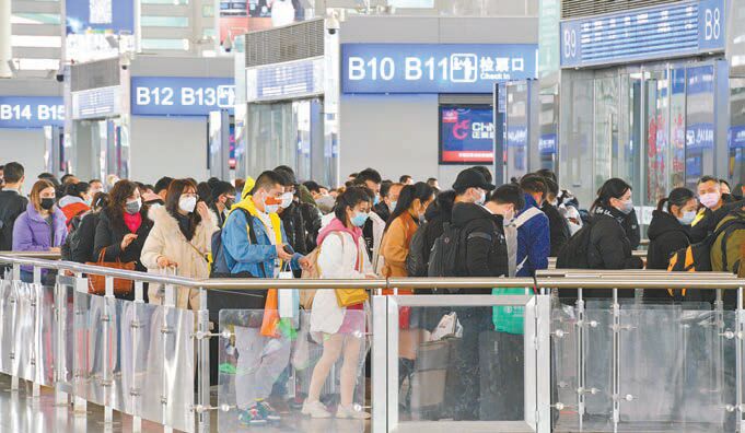昨日,內地陸續出現返城復工潮,四川成都火車東站候車大廳內旅客排隊進站。中新社