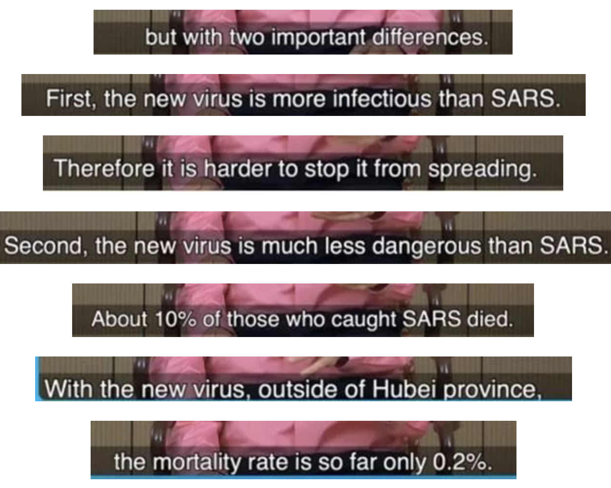 然后,在这个致死率的前提之下,他才从开始将NCP与流感进行了比较,指出流感的致死率是0.1%,称“从致死率上来看,新病毒更接近流感而不是SARS”。
