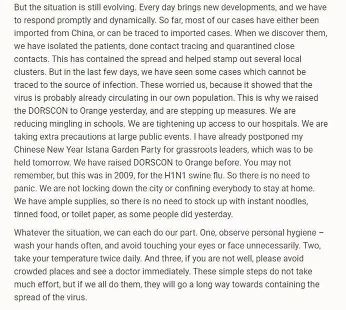 但耿直哥在观看了李显龙发表的电视讲话,以及新加坡总理办公室给出的讲话原文后发现,虽然李显龙在2月8日发表的这番关于新加坡NCP疫情的讲话中,确实把此次NCP疫情,和2009年美国等国出现的H1N1流感疫情进行了比较,但他的讲话内容,与这些自媒体账号所总结的,还是有较大区别的。