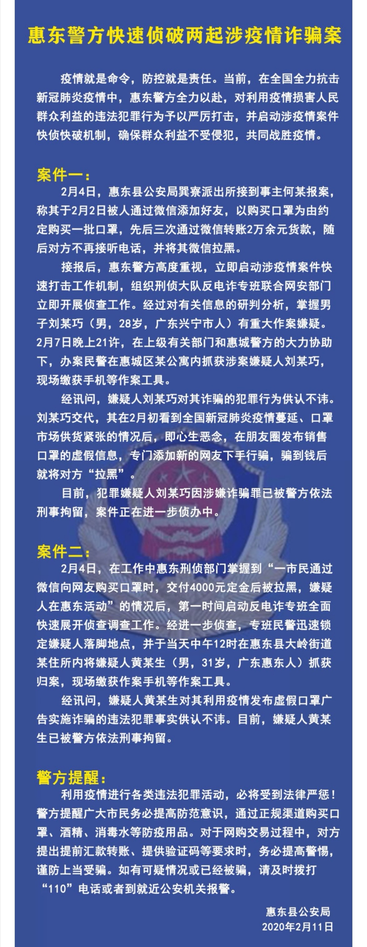 【香港商报网讯】记者卢伟报道:11日,惠州市惠东县公安局向媒体通报,该县快速侦破两起涉疫情诈骗案。