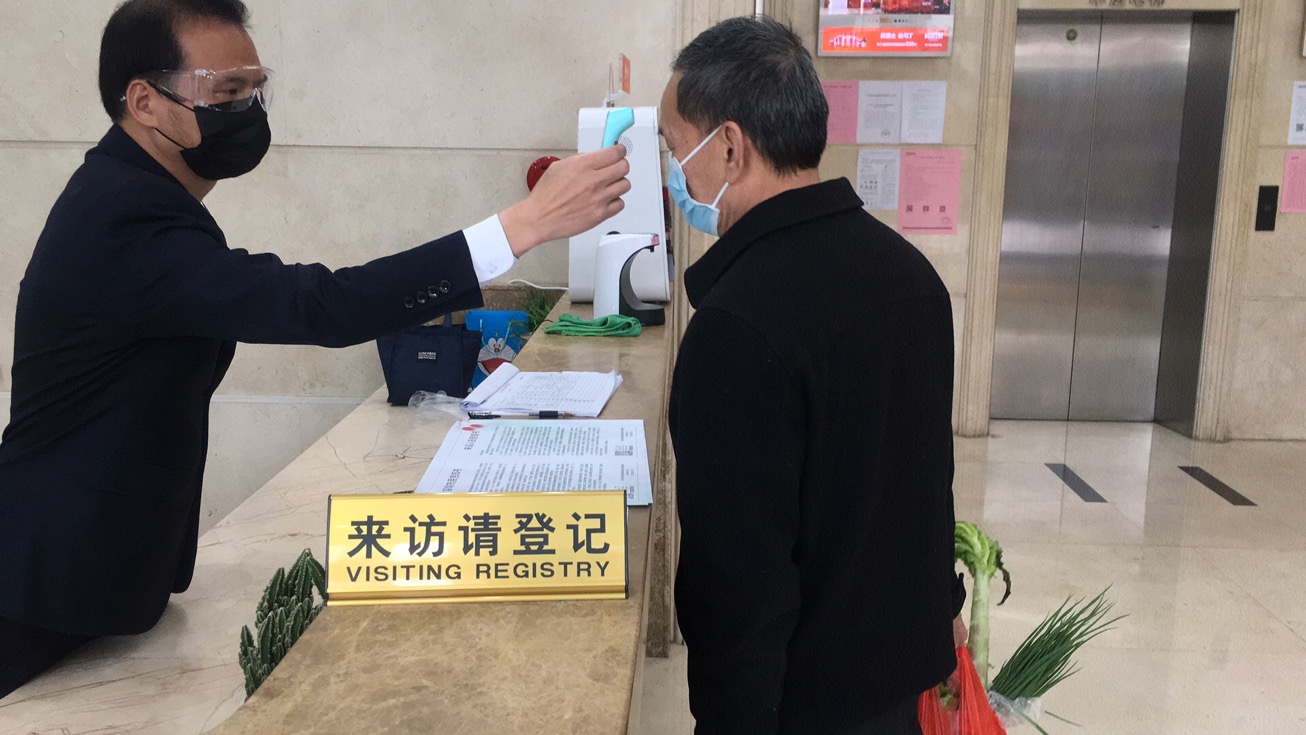 2月10日一早,鴻隆世紀廣場大廈入口處就有了體溫測量點,停車場出、入口,都有佩戴口罩的管理人員,大堂和電梯里都可以聞到消毒水的味道。據了解,鴻隆世紀廣場大廈大堂及周圍的垃圾桶、休閑椅每天會有不少於4次的消毒,電梯每一個小時就會消毒一次。