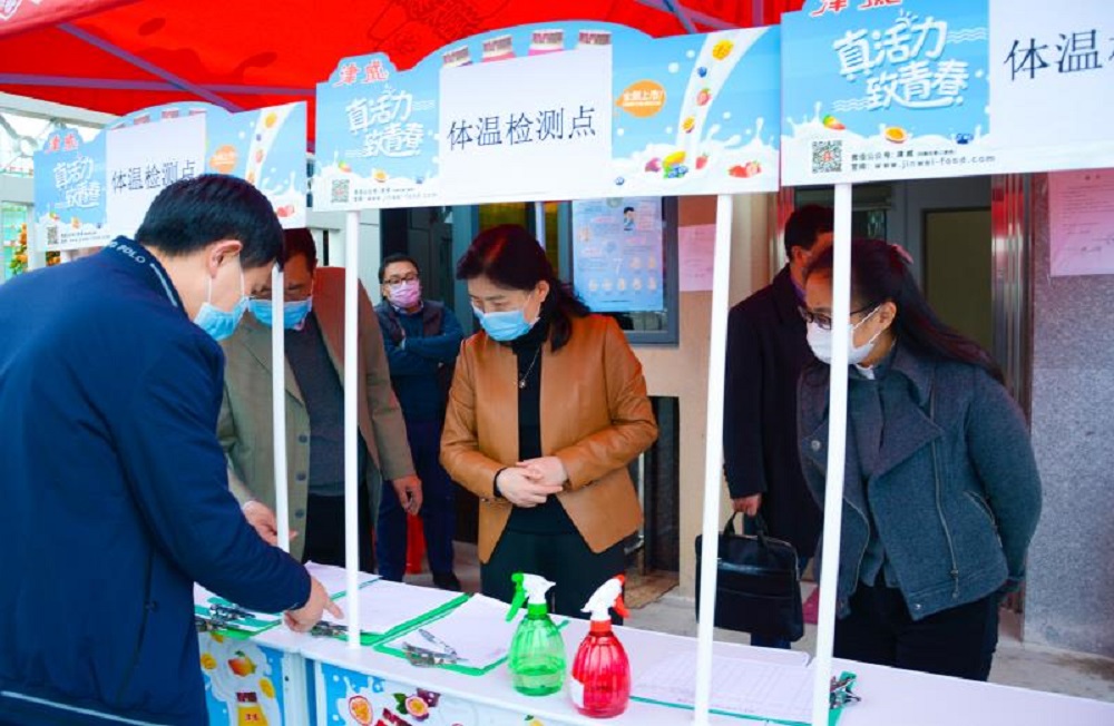 在東莞石龍津威飲料食品有限公司黃洲第二分廠,檢查組實地走訪了生產車間和食堂,了解企業復工情況及車間消毒、隔離區設置等方面工作。公司現為部分復工,目前公司有充足的口罩、酒精、洗手液等防疫物資,公司實行進出口管制措施,員工進入生產車間前,必須進行一系列的消毒,食堂實行嚴格消毒並分批次就餐。