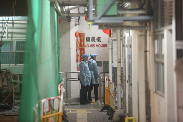 大批警員及衛生署人員到長康邨展開檢疫行動。中新社
