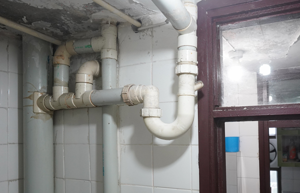 康美樓單位內,糞渠、U 型管和排氣管等縱橫交錯。 記者 區天海攝