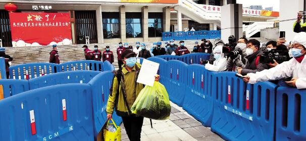 武汉大学人民医院副院长、武昌方舱医院院长万军把康复的患者们逐一送到门外。他说,出院前,每一名康复者的情况都是经专家反复审核——三天没有发烧、体温持续正常;呼吸道症状明显好转;胸部影像学显示炎症明显吸收;核酸2次检测阴性……只有这些条件全部满足的患者,才会列入“出舱”名单。