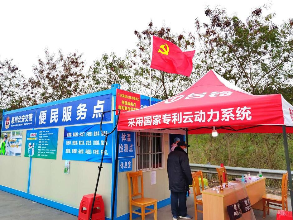 博罗县公庄镇,2条(武深、广河)高速途径,过境车流量大,人员来往密集,防控任务重,该民兵应急分队每天坚守在岗位上,昼夜轮岗值守,冷了,进移动集装箱暖暖身子;累了,在椅子上小憩一会;饿了,拿方便面充饥,但是,却没有一个人叫苦叫累,没有一个人要求换岗休息,没有一个人请假休假。