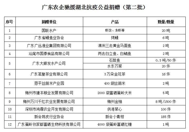 在此之前,第一批廣東農企馳援湖北抗疫公益捐贈共收到水產品、蔬果菜等捐贈物資82.3噸,以及4000枚新鮮雞蛋和1噸酸奶,總價值306.15萬元,在2月8日順利抵達湖北黃岡,登上了抗疫一線人員的餐桌。