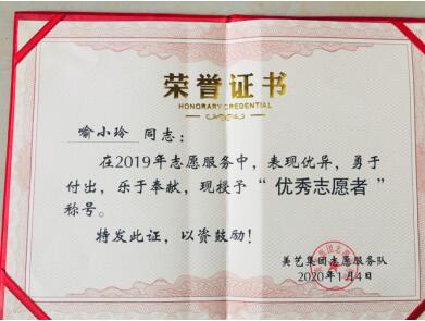 喻小玲是一个干练、热情的重庆妹子,来惠阳区镇隆工作和生活了10年的她,是美艺集团昱庆公司志愿服务队的一名志愿者。自该公司志愿服务队成立开始就参加了当地许多包括环境卫生整治、救助帮扶、文体活动等志愿活动。2017年,喻小玲注册了惠州市志愿者会员,从此,她利用业余时间报名参加了许多仲恺区、惠州市组织的志愿活动,那时她甚至还不知道什么叫服务时长,这有什么用处;只知道参加志愿活动不仅让她充实了生活,帮助了别人,又能让自己感到快乐,正是这一份热情和快乐的感受,使她不愿错过每一次志愿活动,也正是这种送人玫瑰,手留余香的精神,使她在志愿服务的道路上一直前行着,过程中也获得了大家的一致好评和无数的殊荣。