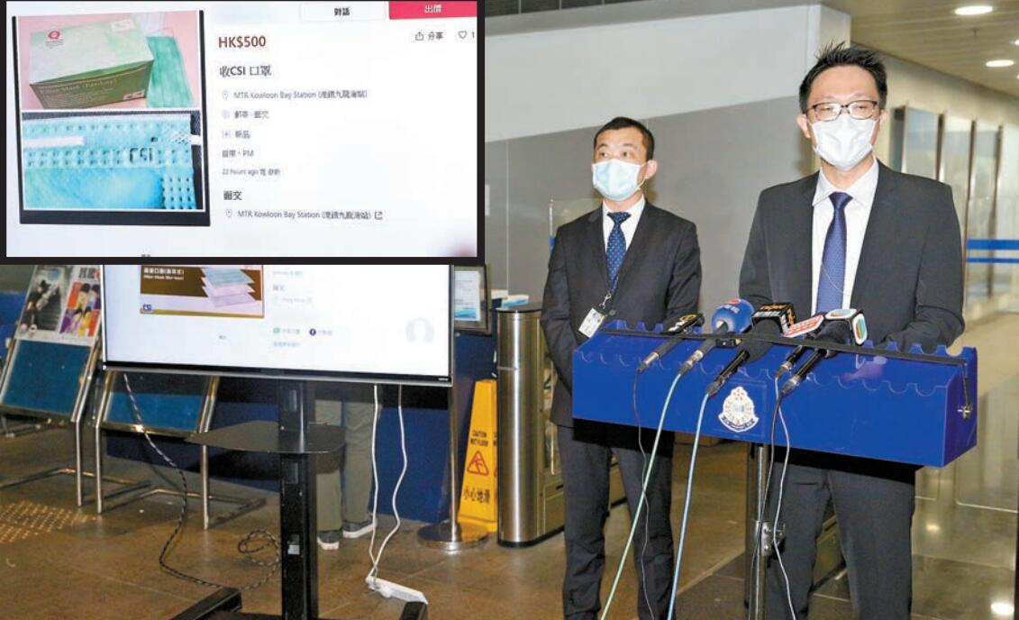 另外,警方接获2宗公立医院偷口罩案件,其中一宗在玛嘉烈医院拘捕一名56岁外判女清洁工,另一宗案由东九龙区重案组探员调查中。萧指,警方将加强网上巡逻及情报分析,将骗徒缉拿归案。