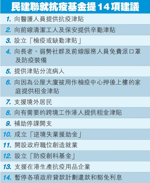 民建聯認為今次疫情非常嚴峻,加上停業停課衍生大量問題,以及大批港人滯留外地,相信政府需要兼顧的工作,以及市民和行業需要的支援都非常大,認為防疫基金不能以100億元為限,必須因應疫情變化及實際需求而「加碼」,並盡快提交立法會審批及通過。