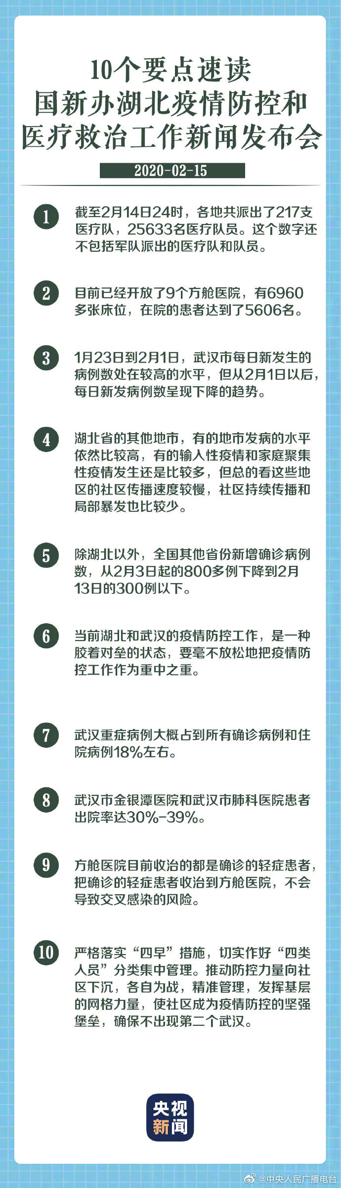 他还介绍,目前,已经开放了9个方舱医院,有6960多张床位,在院患者达到了5606名。下一步,将根据需要继续腾出医院部分的病房,征用部分场馆,改造为定点医院和方舱医院,确保已排查、确诊的患者和疑似患者都能够得到集中的收治,确保所有没有收治的患者人数清零。