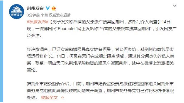 经连夜调查,已证实该微博网民真实姓名何昊,其父何炎仿,系荆州市商务局市场运行科科长。14日,何昊在天门完成规定隔离期后,通过其父何炎仿的私人关系,联系一辆由天门来荆州采购物资的顺风车返回荆州,途中在微博上发表相关言论。