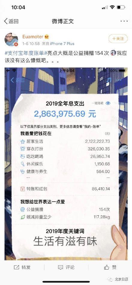随后,该网友被扒出曾晒自己的支付宝年度账单,图片显示其2019年全年总支出达286万余元。