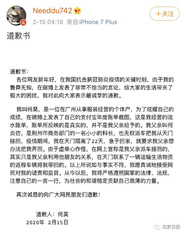 今天凌晨4时许,该网友在微博中发表道歉书,回应“自称被当官的父亲派车接回荆州”和“2019年支付宝账单”一事。该网友自称: