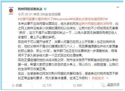 今晨5时许,@荆州网警巡查执法 证实此事,并呼吁网友把注意力放在抗疫斗争上,同心协力战胜疫情。