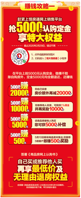根据恒大政策,购房者只需在“恒房通”平台线上缴纳5000元定金并签署《商品房网上认购书》,即可在全国恒大楼盘预定房源。自签署《商品房买卖合同》之日起至5月10日,便享有“最低价购房”权益。也就是说,如购买楼盘价格下调,可获补差价,并可享受“无理由退房”权益保证。对于购房者而言,双保险让购房者彻底打消“怕买贵、怕买错”的后顾之忧。