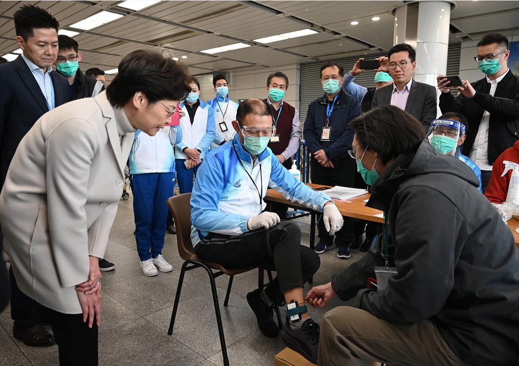 林鄭月娥(左二)在深圳灣口岸了解如何為須檢疫人士佩戴電子手環,以監察他們有否留在居所。圖:政府新聞處
