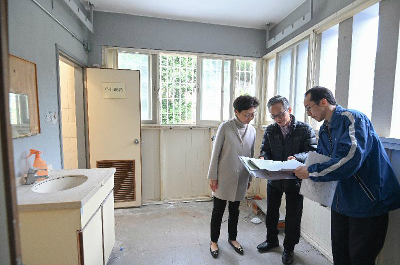 林鄭月娥(左一)在八鄉少年警訊中心了解將中心內部分設施改建成檢疫中心的工程進度。圖:政府新聞處